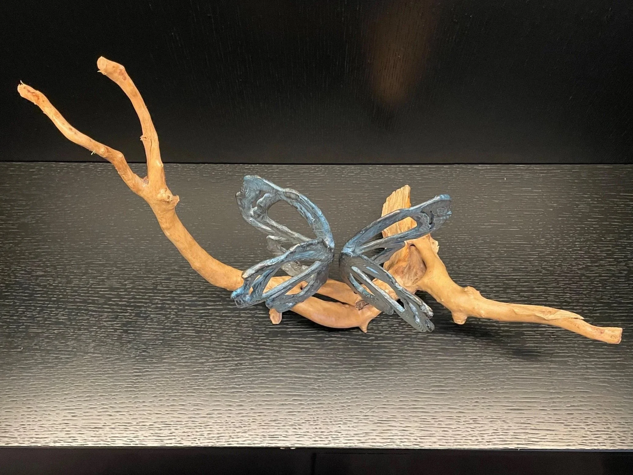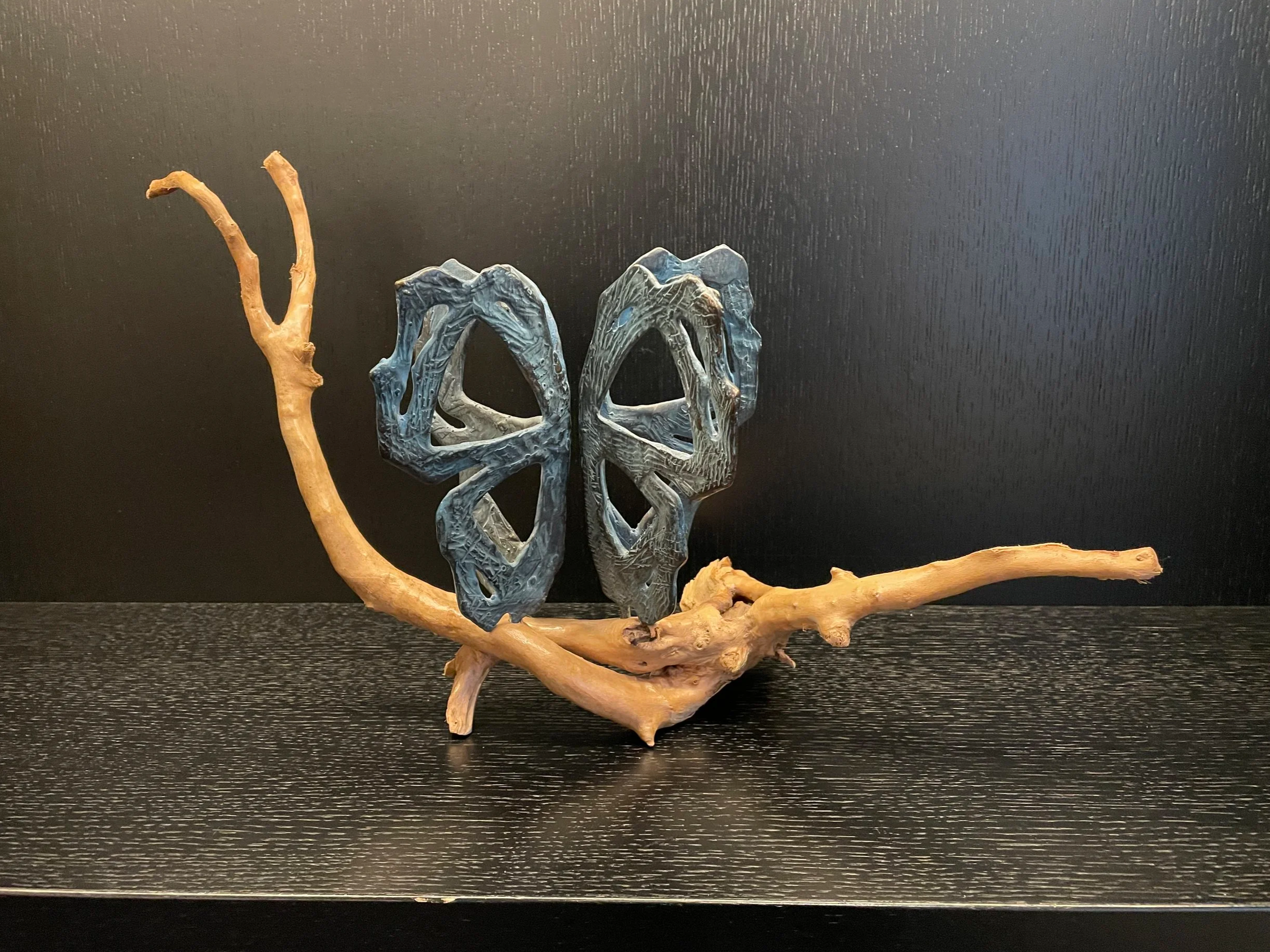Butterflies undergo a transformation. In this composition the two are in close proximity to each other so much that from one angle they become one. This piece was originally a mock up for a 4 meter public sculpture installation. This scale is a precious table top size of a monumental piece. Bronze sculpture of two butterflies on natural organic wood. Perfect interior decoration.