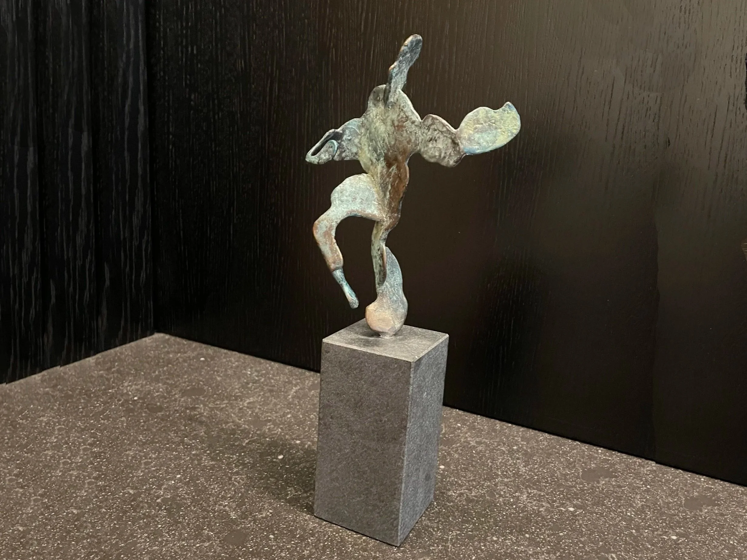 Dancing figure was created as a play of forms in wax. I was testing out angling planes. I loved what was happening and so it was! This scale is created to stand proud and to energize an interior space. his gorgeous sculpture of figure who has reached the top of a cliff is dancing in victory. It the perfect touch to bring joy and flow to an interior design. It fits on a tabletop and is well suited for positive energy flow indoors. For instance in the living room, hallway, or bedroom.